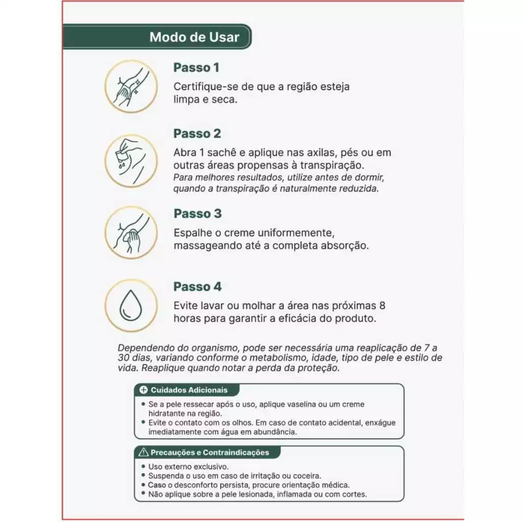Nutrição profunda da pele, auxiliando em casos de ressecamento e aspereza causados pela transpiração prolongada